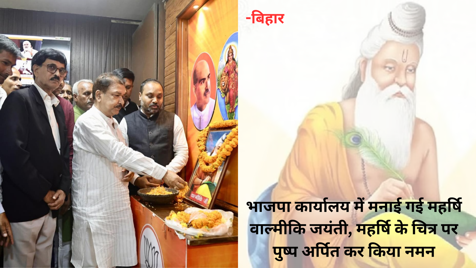 पटना , बिहार भाजपा प्रदेश कार्यालय में आज महर्षि वाल्मीकि जयंती मनाई गई। इस मौके पर आयोजित कार्यक्रम में भाजपा के प्रदेश अध्यक्ष डॉ. दिलीप जायसवाल भी शामिल हुए। उन्होंने महर्षि वाल्मीकि के तैलचित्र पर पुष्प अर्पित कर उन्हें सादर नमन किया।