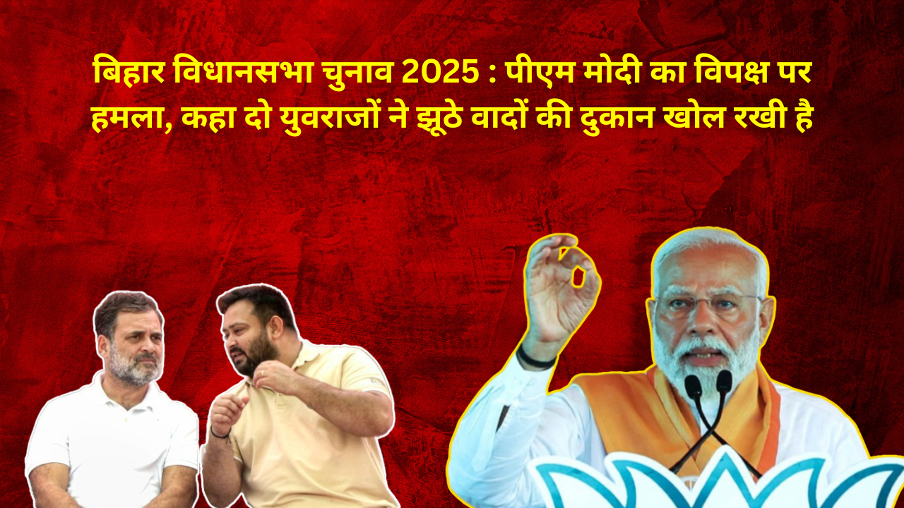 पटना में आयोजित एनडीए की चुनावी सभा में पीएम मोदी ने कहा कि दो युवराजों ने झूठे वादे करने की दुकान खोल रखी है। उनके अपने लोगों को भी उन पर भरोसा नहीं है। उन्होंने आगे कहा कि बिहार की जनता अब उन लोगों के बहकावे में नहीं आएगी जिन्होंने अपने शासन में सिर्फ भ्रष्टाचार, कुशासन और परिवारवाद को बढ़ावा दिया।